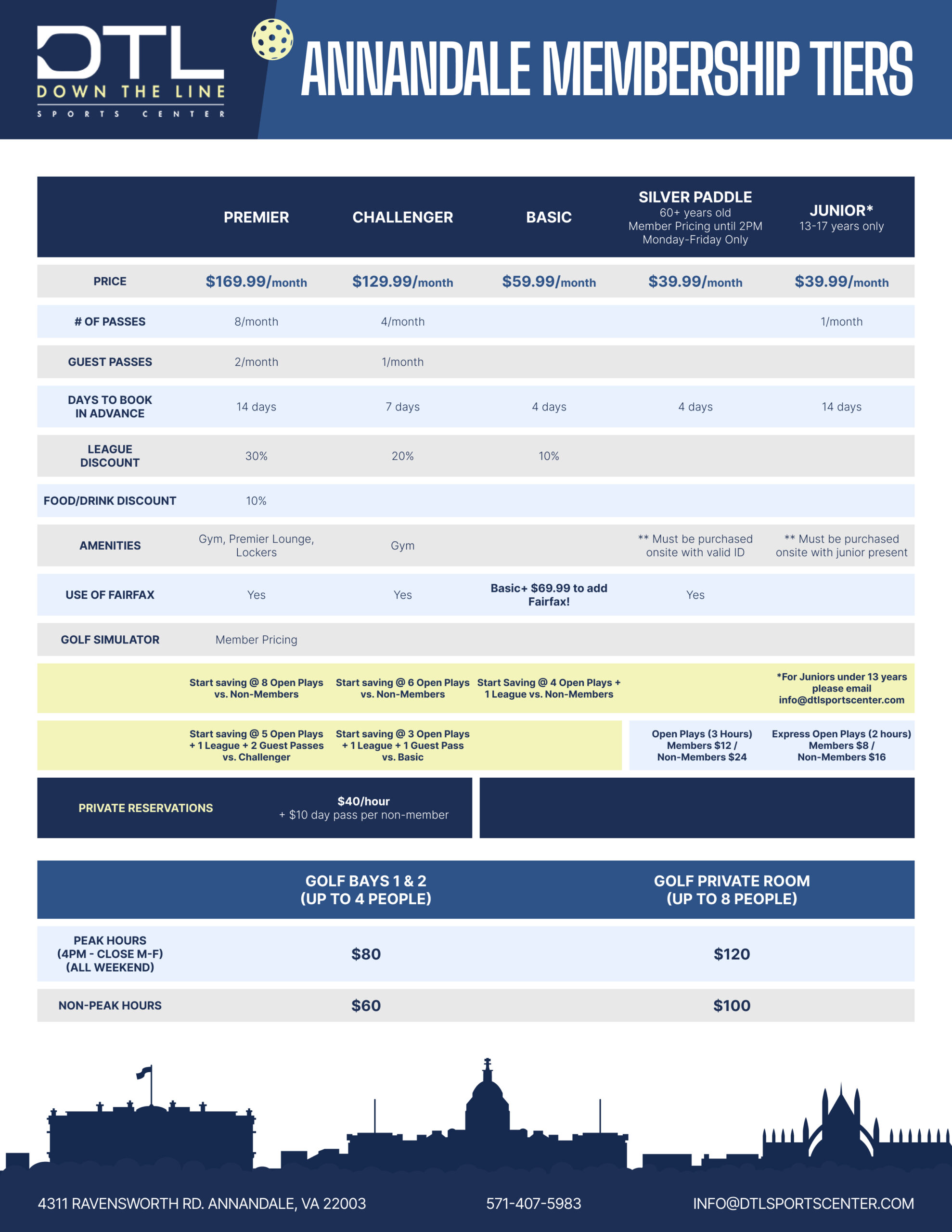 Located in the heart of Annandale, VA, the upcoming facility will offer state of the art courts, expert coaching, and a vibrant social atmosphere – including cutting edge golf simulators, food + drinks.
